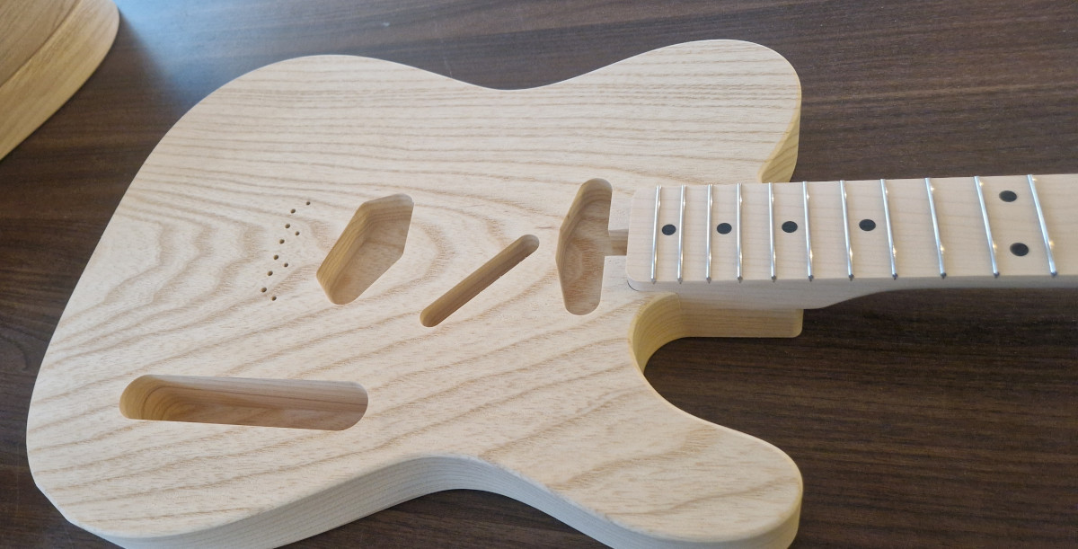 Här har vi en Parts of Sweden, Made in Stockholm, 1P Swamp ash body. Fin i ådringen och riktigt riktigt lätt. 1,68 kg för en fulltjock Tele är sällsynt lätt. Kroppen är fräst i profesionell CNC efter 50's form. Här kan du lite på att allt linjerar som det ska.