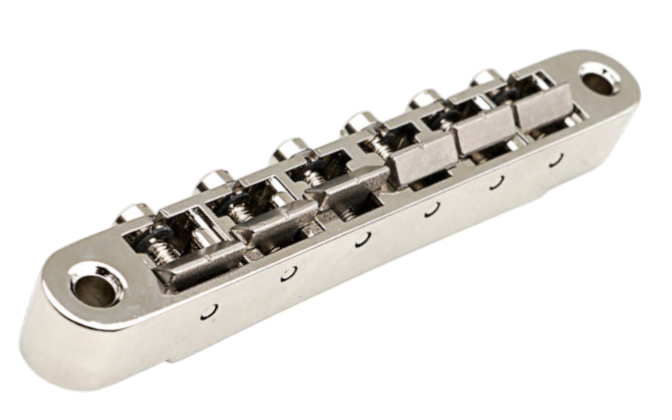 Perhaps the most vintage correct replacement bridge available on the market today! No rattle-causing retainer wire! Flat top saddles provide tight, 100% mechanical contact in the ABR frame. Available in various frame and saddle finishes. Saddles have starter notches dead center. Use this ABRH model bridge on your Gibson Historic or any guitar using ABR-1 sized (6-32) bridge posts, including most original "tune-o-matic" equipped Gibson guitars prior to the introduction of the Nashville bridge. No modifications and nothing else needed! A direct "drop on" replacement! Removable saddles - replace a worn saddle, or turn a saddle around for more accurate intonation. Nickel plated with Titanium saddles.