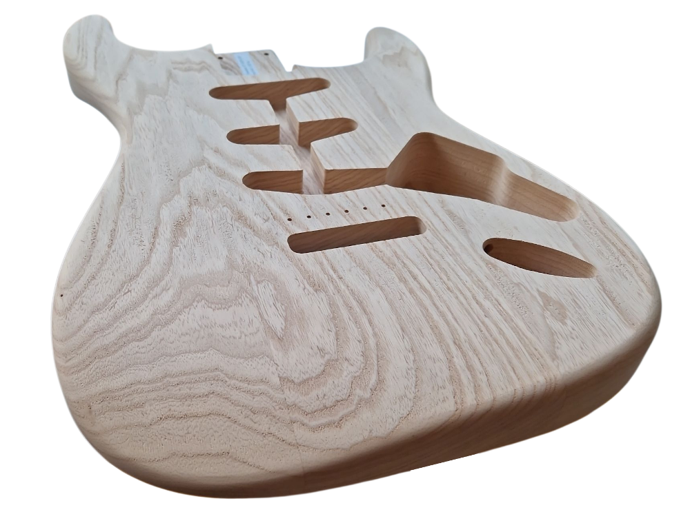 Fräst i Stockholm i finaste Swamp Ash. Vi har letat efter en Stratakropp med samma former och mått som på tidigt 60-tal ända sedan vi stratade Gitarrdelar. Den är mer "slimmad", lite större belly cut och armcut som går längre ner. Övre hornet är också lite nättare i sin form än på moderna kroppar.