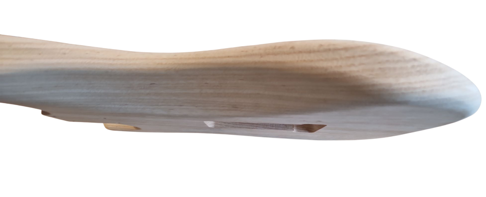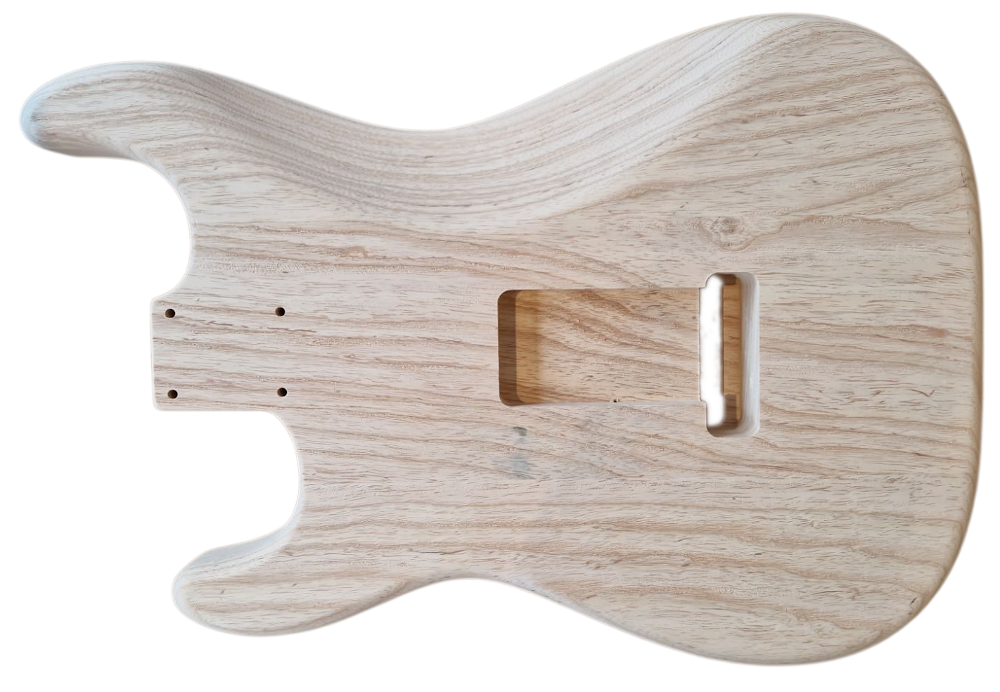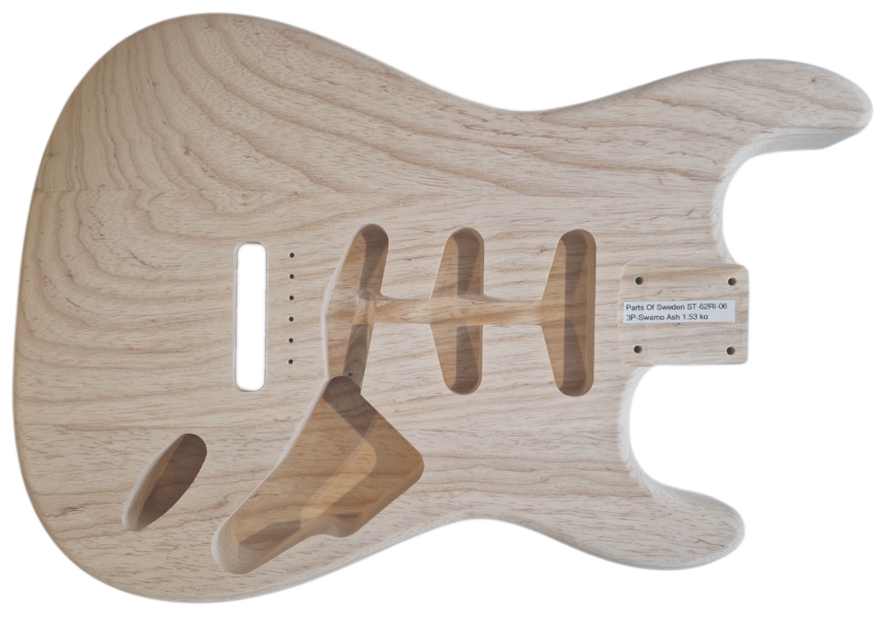 Fräst i Stockholm i finaste Swamp Ash. Vi har letat efter en Stratakropp med samma former och mått som på tidigt 60-tal ända sedan vi stratade Gitarrdelar. Den är mer "slimmad", lite större belly cut och armcut som går längre ner. Övre hornet är också lite nättare i sin form än på moderna kroppar.