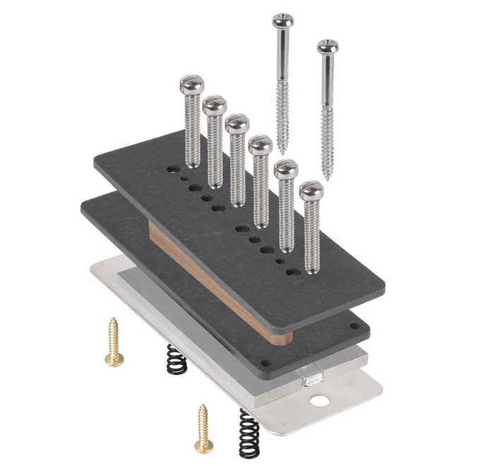 Nickel-silver baseplate Nickel-plated polepiece screws Alnico 5 magnets with steel spacer Mounting screws and springs Coil lead wires Single-conductor braided-shield hookup wire