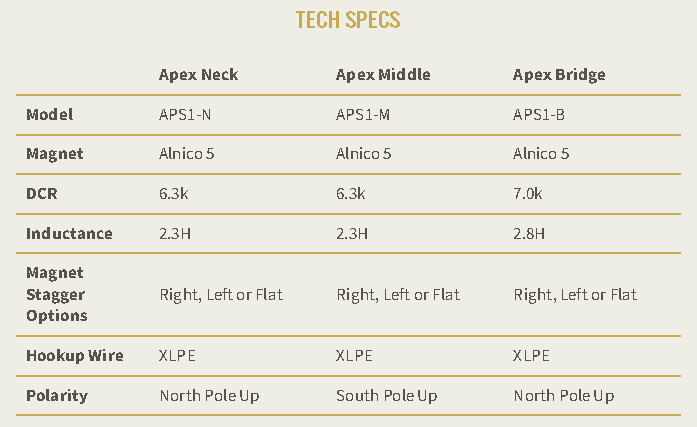 The Apex Classic allows players to enjoy breathtaking vintage Strat tone - rich with detail and with bell-like chime, but without the hum. From stage to studio, our twin coil design allows for the natural movement of the strings to be unimpeded, and the lack of metal plates choking the magnetic circuit mean that the Apex doesn't have the harsh, nasal sound of many other hum-cancelling pickups.  This breakthrough design delivers superb tone even in the hard to recreate "quack" positions (the 2 and 4 parallel positions on a five-way switch).  The ultimate players pickup, the Apex Classic makes any Strat "unputdownable!"